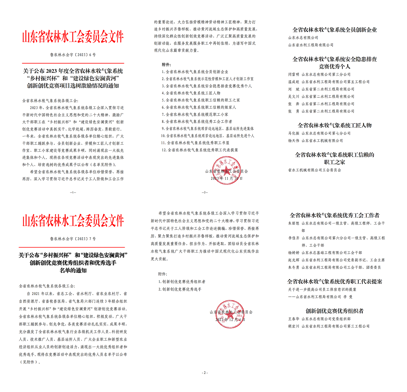 近日,山东水总、山东水局在山东省农林水工会组织的山东省农林水牧气象系统“乡村振兴杯”创新创优竞赛中获多项荣誉。其中,山东水总、山东水局获“全省农林水牧气象系统全员创新企业”称号,山东水总水工机械公司工会获“职工信赖的职工之家”称号,闫雷明等16名员工分别获“安全隐患排查竞赛优秀个人”“工匠人物”“优秀工会工作者”“优秀职工代表提案”“创新创优竞赛优秀组织者”等称号。